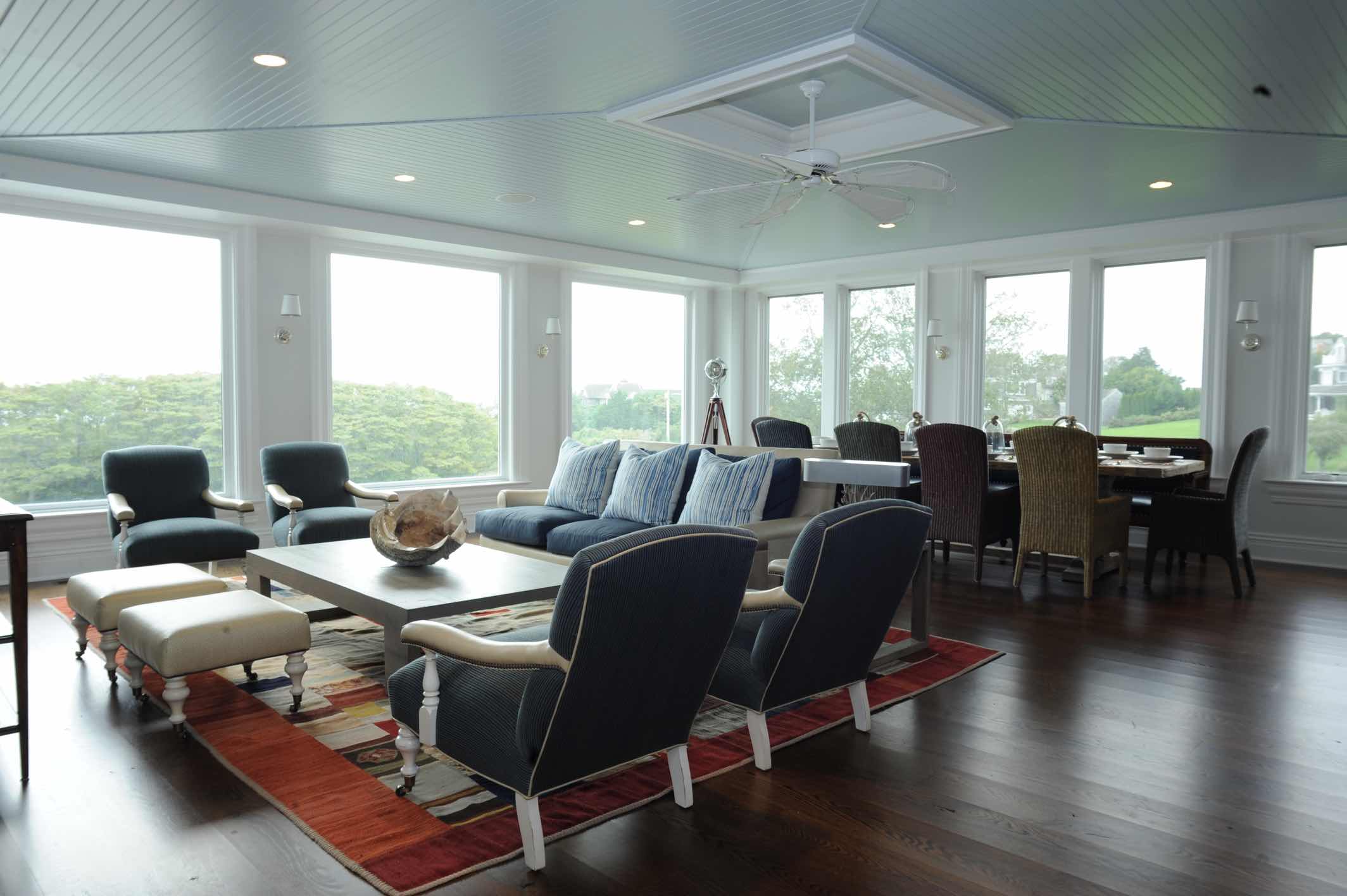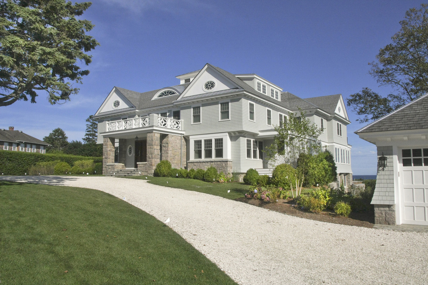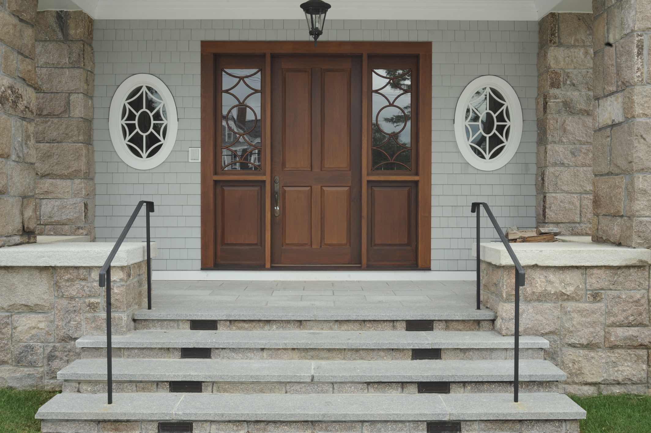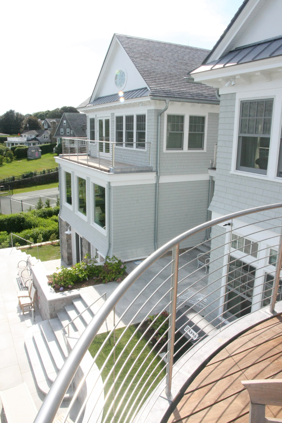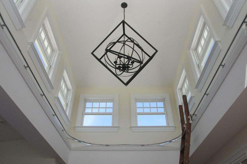 This truly custom house included reuse of the original front door stone entry and columns, which were painstakingly removed, stored and then reinstalled at the relocated front door entry. As the client wanted this house to stand the test of time, the structure was largely constructed of steel from the basement to the roof. The use of new green products was considered for everything and used for the roof, insulation and windows. The interior of the house has exquisite detail in every room, ranging from multi-piece crown moldings to solid eight-foot custom doors to secret rooms hidden behind bookcases. Another charming detail was a cupola with a library ladder to experience 360-degree ocean views.
