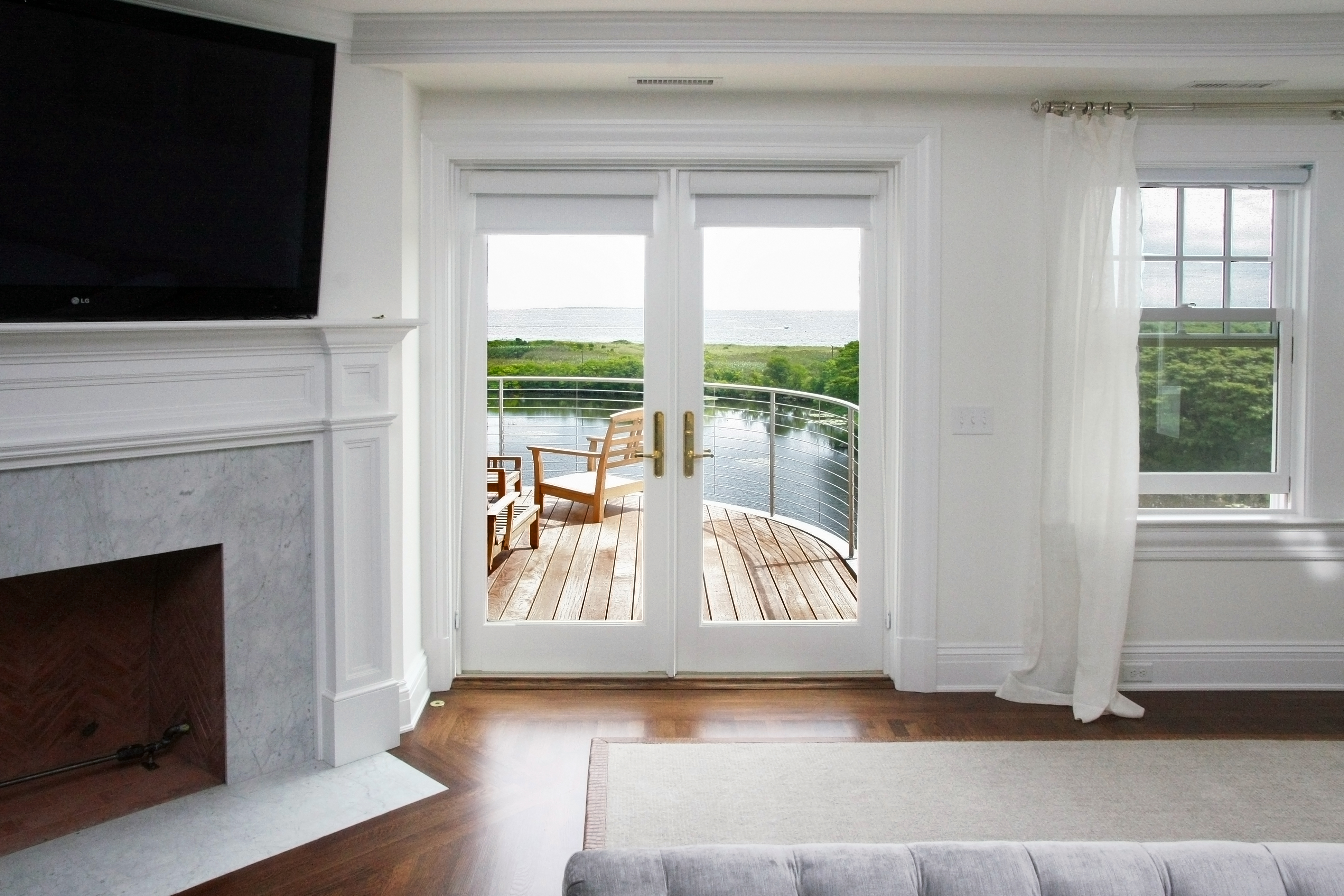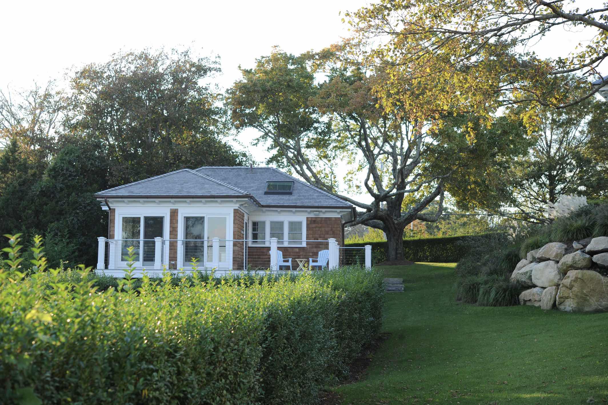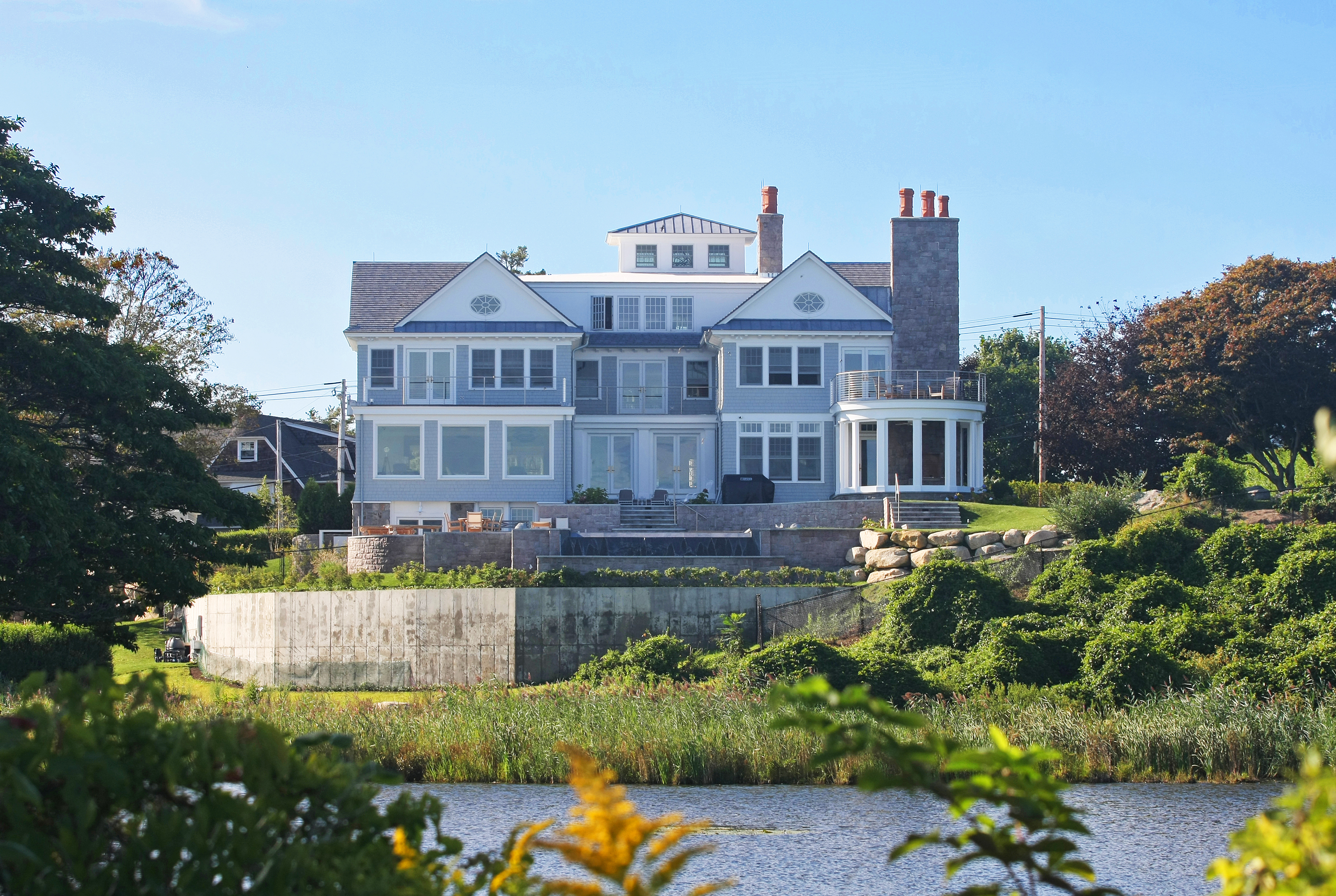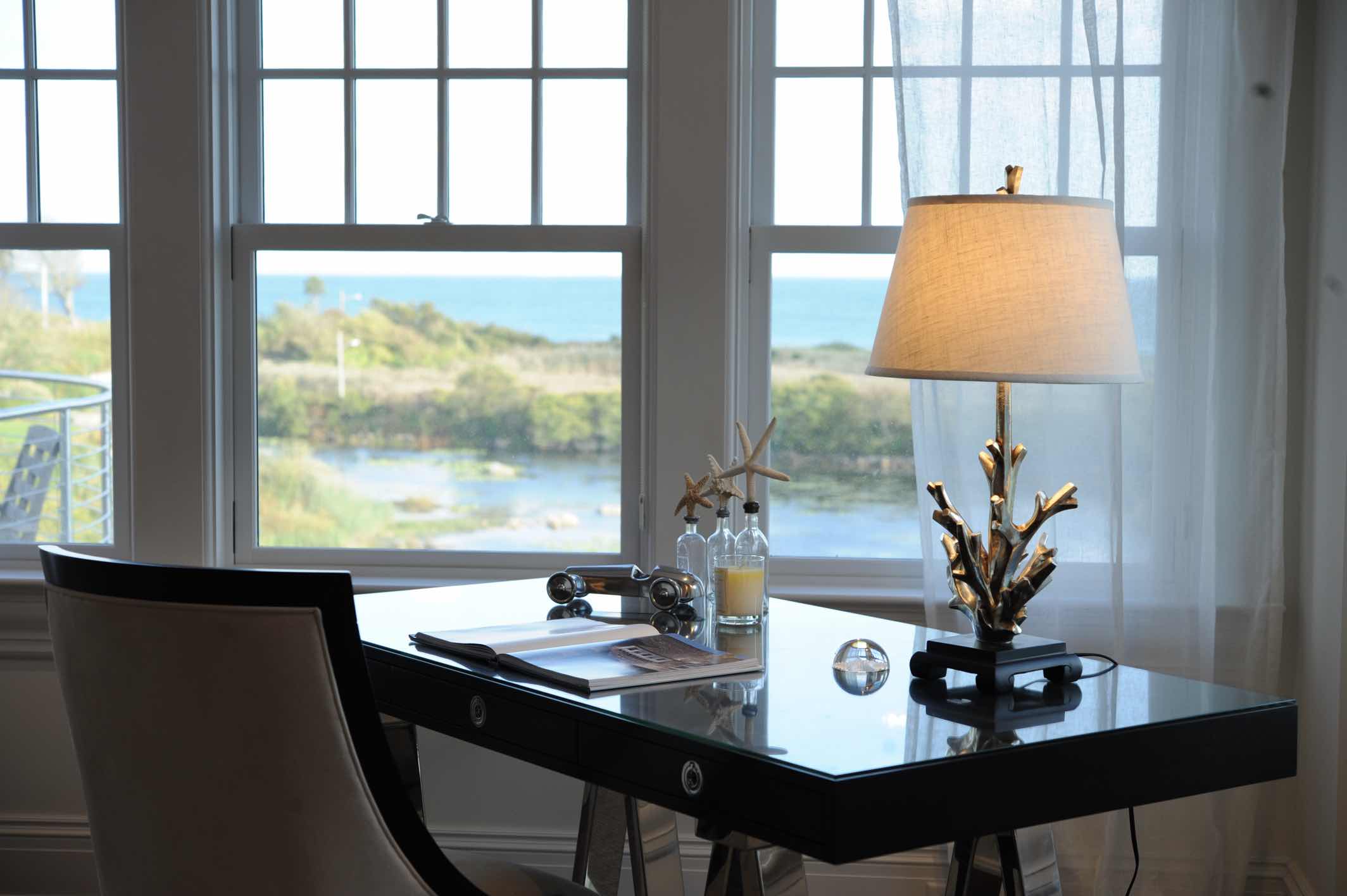 This truly custom house included reuse of the original front door stone entry and columns, which were painstakingly removed, stored and then reinstalled at the relocated front door entry. As the client wanted this house to stand the test of time, the structure was largely constructed of steel from the basement to the roof. The use of new green products was considered for everything and used for the roof, insulation and windows. The interior of the house has exquisite detail in every room, ranging from multi-piece crown moldings to solid eight-foot custom doors to secret rooms hidden behind bookcases. Another charming detail was a cupola with a library ladder to experience 360-degree ocean views.