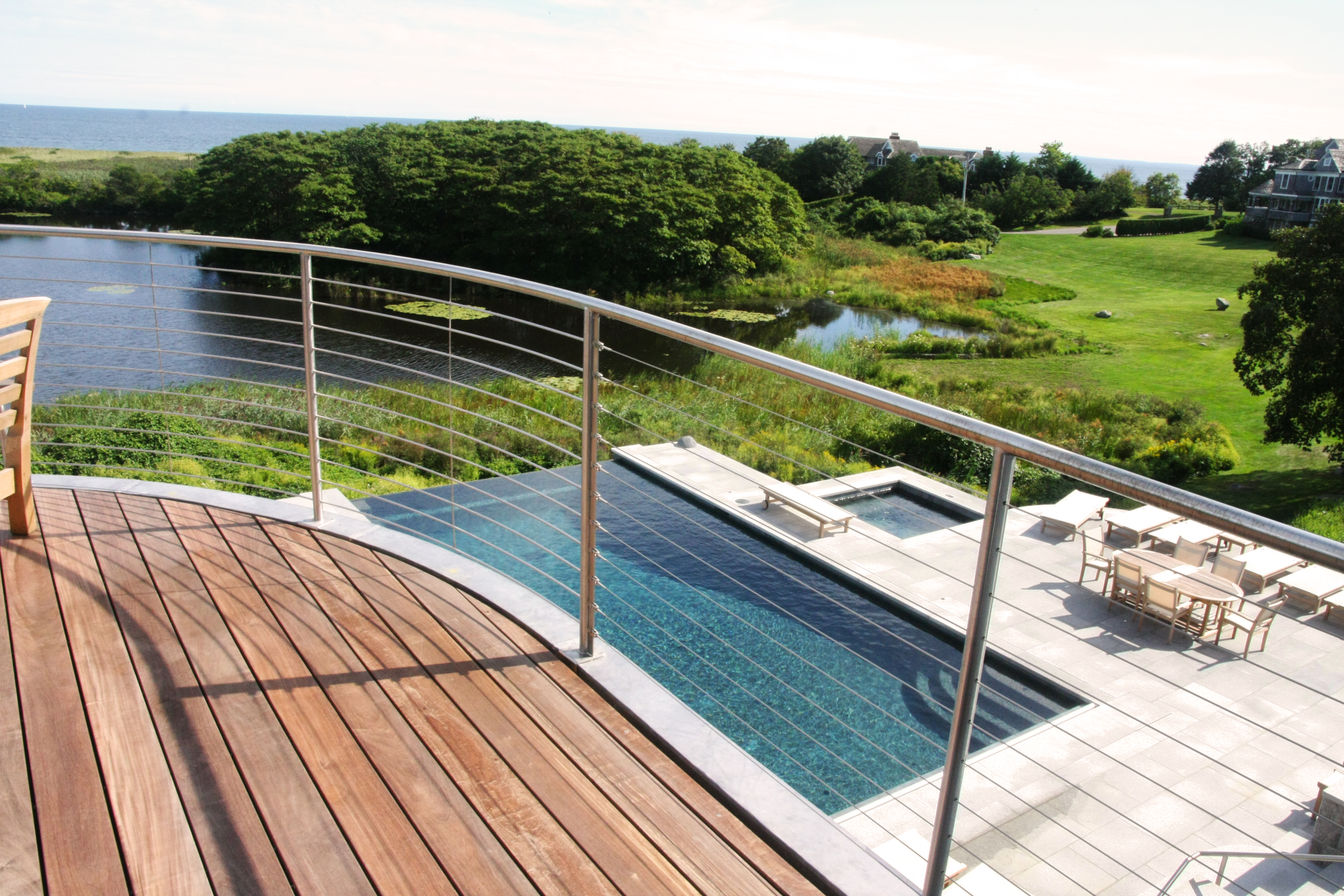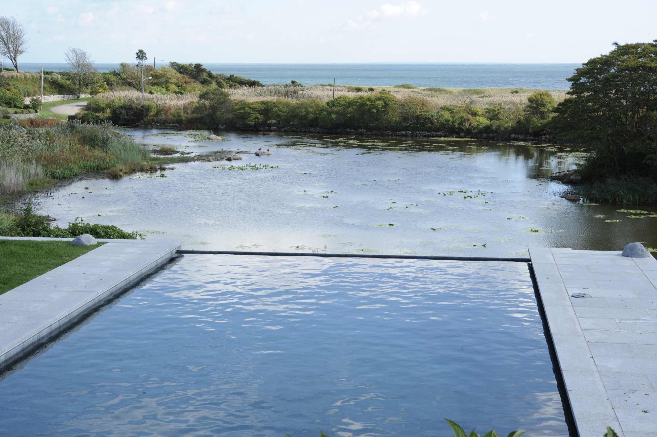 A site engineering challenge included building an exceptional invisible edge pool that was constructed on a 42-feet of imported fill. The owner’s objective was for the pool to look like it is part of the pond when viewed from the house and rear main windows.
